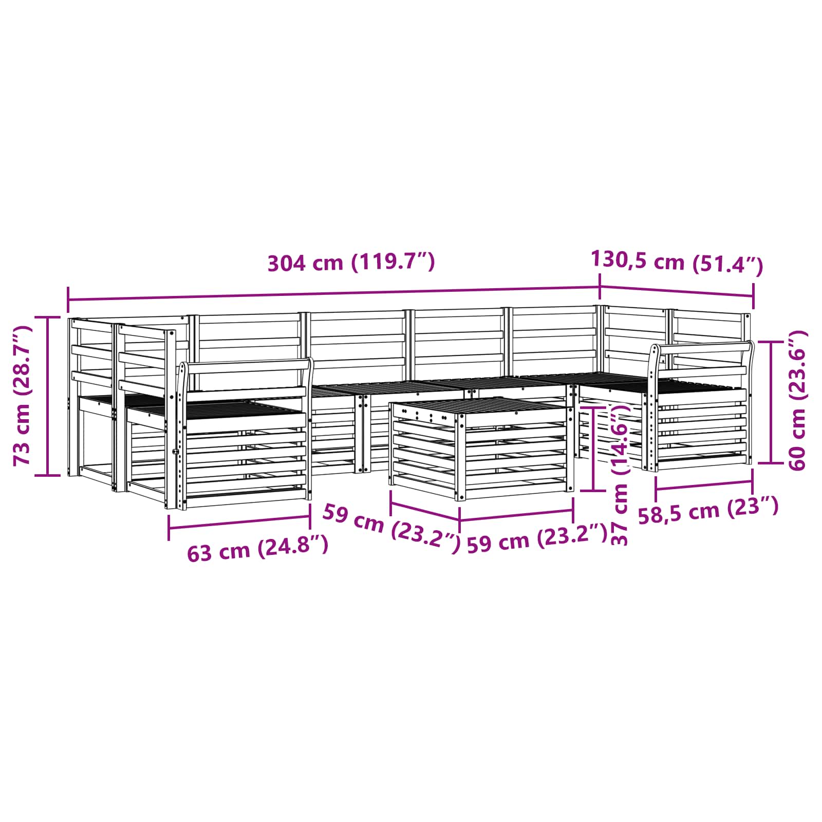 - 5 x Middenbank: 63 x 59 x 73 cm (LxBxH)